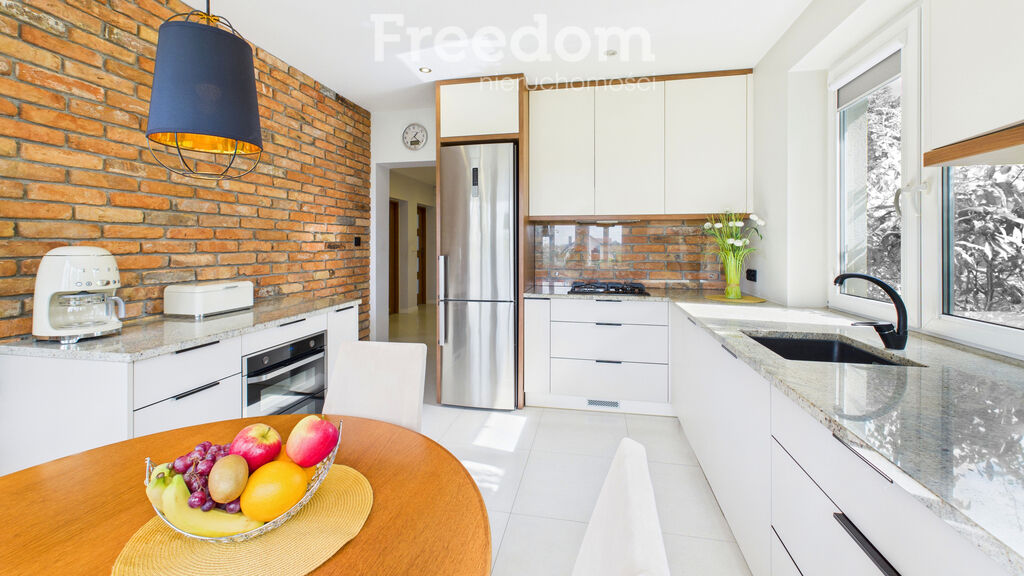 kuchnia z zabudową meblową, granitowymi blatami, oryginalną cegłą